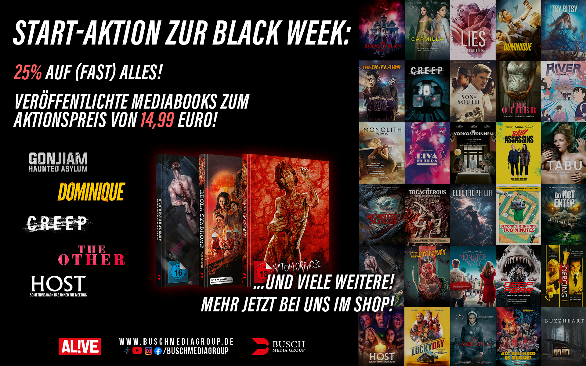 UNSER NEUER SHOP IST ONLINE! Zum Start und zur kommenden BLACK WEEK gibt es dicke Rabatte: 25 Prozent spart ihr auf (fast) alles! Bereits veröffentlichte Mediabooks kosten im Aktionszeitraum nur 14,99 Euro.